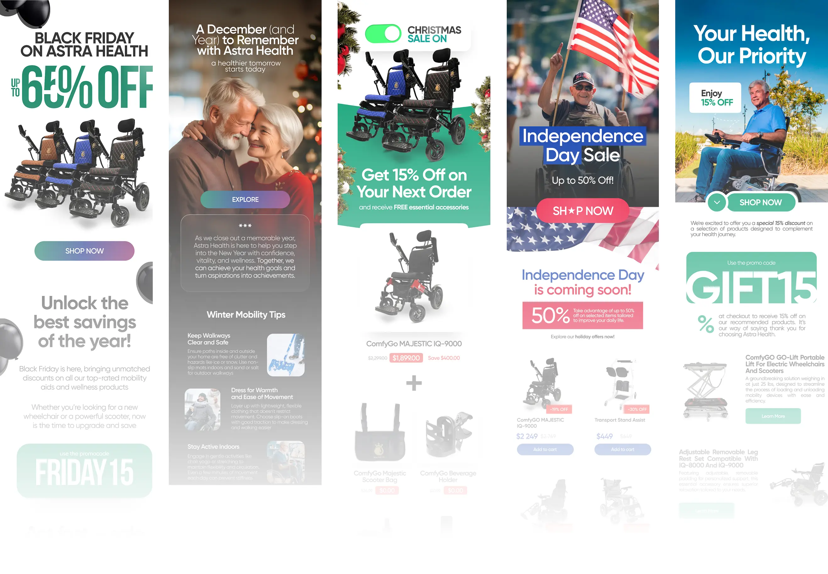 Built from scratch (Meta + Email/SMS) for a US mobility brand (wheelchairs & scooters; ~$3,000 AOV).